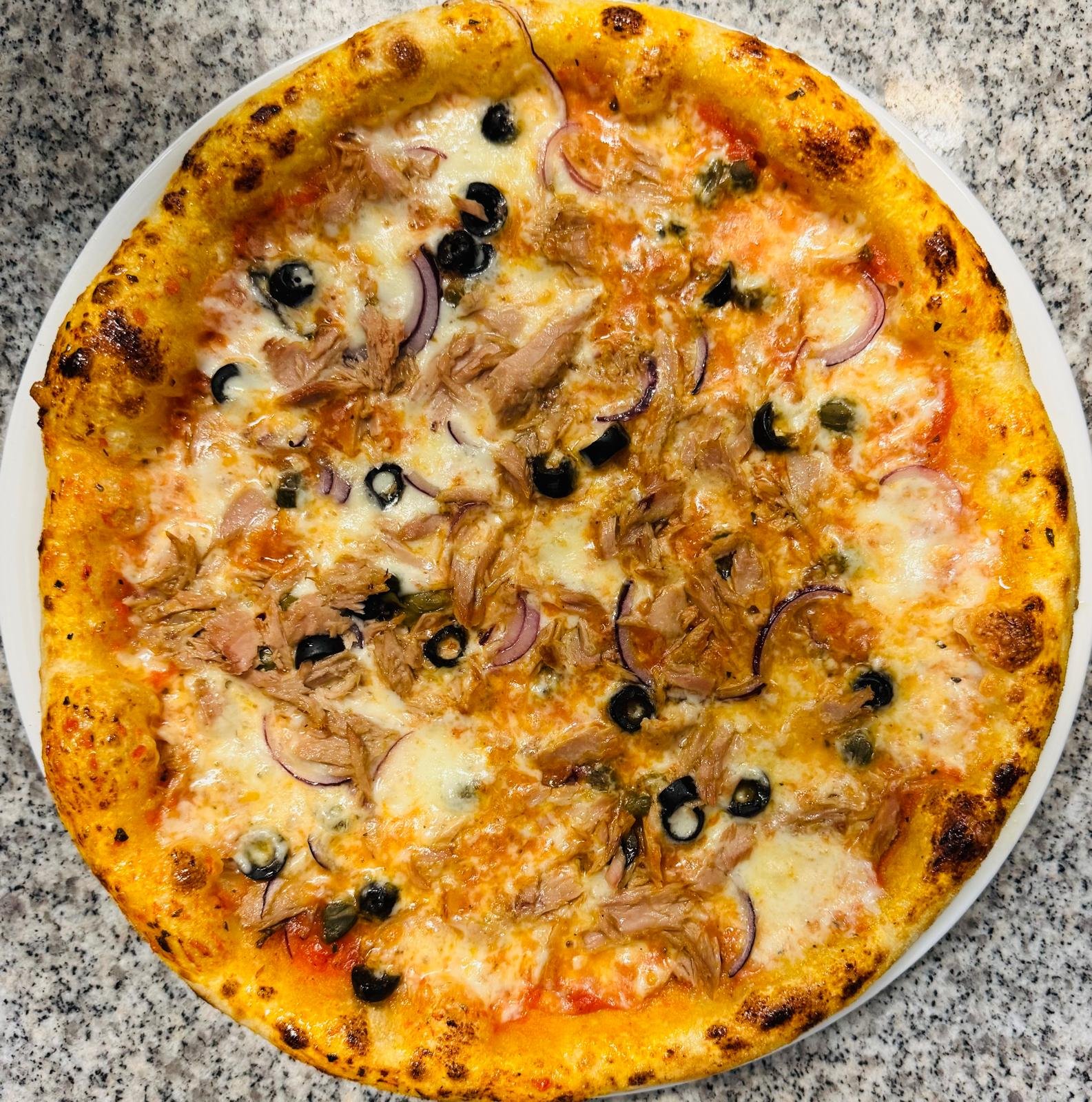 Organic tomato sauce, mozzarella fiordilatte, tuna, olives, capers, red onion and oregano